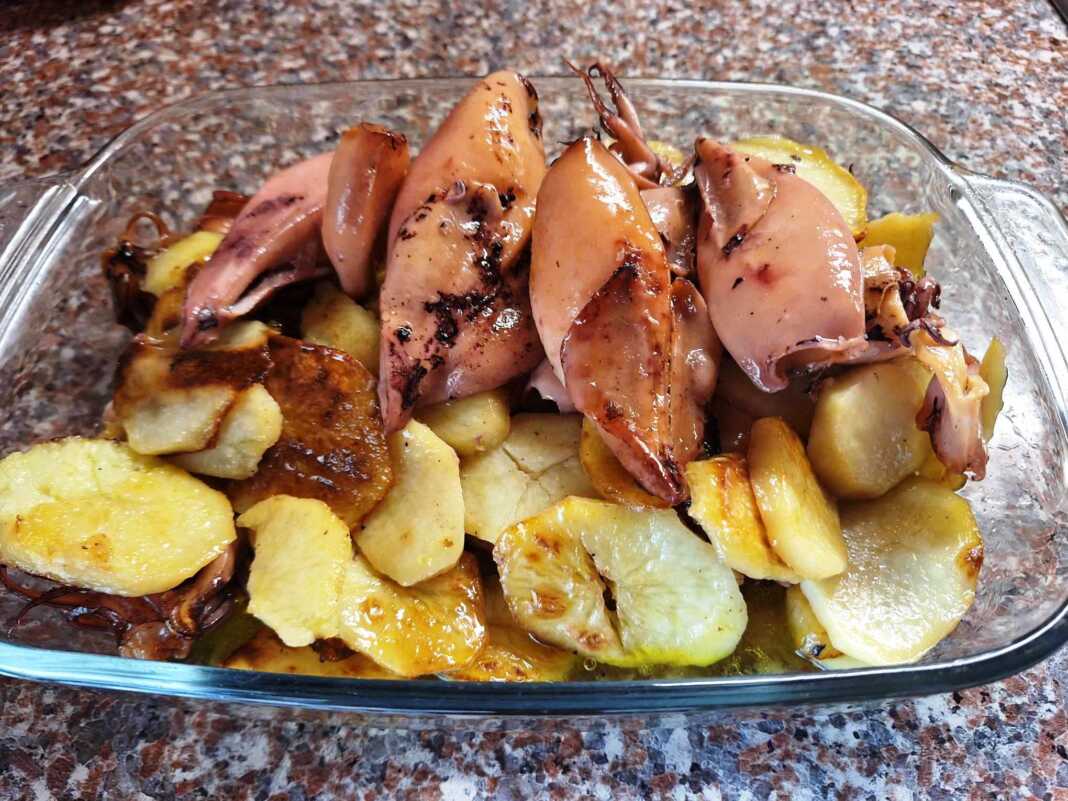 Βάλτε ξανά το ταψί στον φούρνο και ψήστε για άλλα 15-20 λεπτά, μέχρι τα καλαμαράκια να είναι μαγειρεμένα και οι πατάτες να είναι κριτσανιστές.