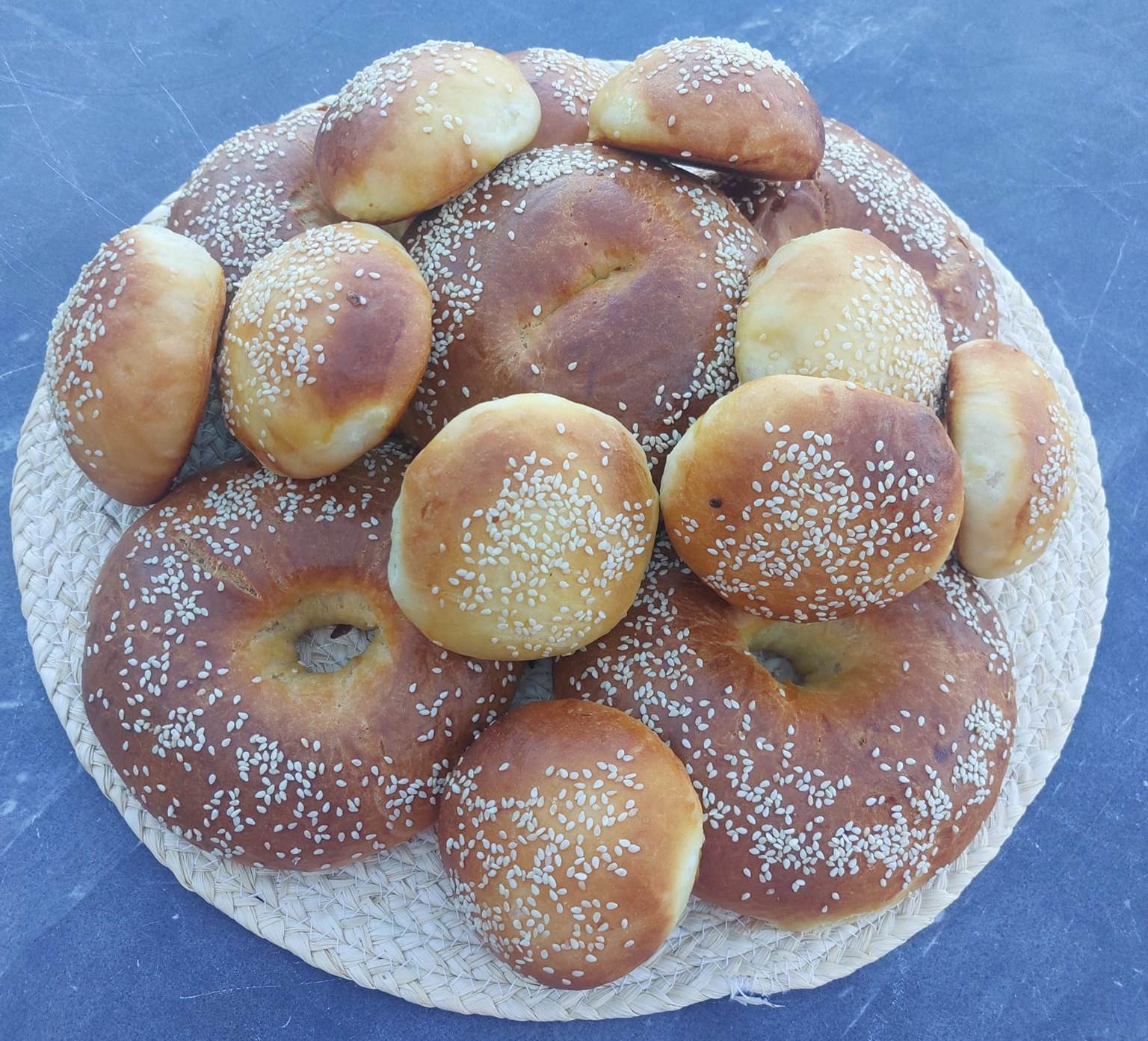 Αλείψτε τα καλiτσούνια με το αραιωμένο κρόκο αυγού και πασπαλίστε με σουσάμι.