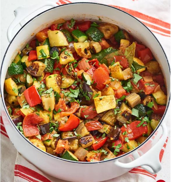 Μειώστε τη φωτιά στη μέση. Προσθέστε το υπόλοιπο 1 κουταλιά της σούπας λάδι και το κρεμμύδι, ρίχνουμε αλάτι και πιπέρι και μαγειρέψτε, ανακατεύοντας περιστασιακά, μέχρι να μαλακώσει και μόλις αρχίσει να γίνετε καφέ, 6 έως 8 λεπτά. Προσθέστε το σκόρδο, θυμάρι και φύλλα δάφνης και μαγειρέψτε μέχρι να αρωματιστούν, περίπου 30 δευτερόλεπτα. Προσθέστε τις ντομάτες και τις πιπεριές. Προσθέτουμε την σοταρισμένη μελιτζάνα και τα κολοκυθάκια και ανακατεύουμε απαλά για να τα συνδυάσουμε όλα μαζί.
