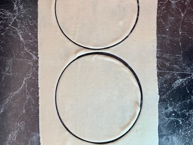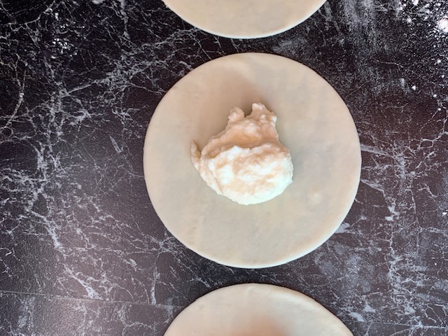 Τοποθετήστε τη ζύμη στον πάγκο, χρησιμοποιήστε ένα στρογγυλό κόφτη για να φτιάξετε μεγάλους κύκλους και τοποθετήστε μια κουταλιά της σούπας από το μείγμα στο κέντρο. Επαναλάβετε για κάθε κύκλου ζύμης.