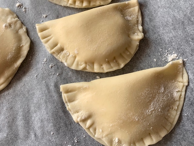 Χρησιμοποιήστε λίγο νερό στη μία άκρη της ζύμης για στεγανοποίηση. Στη συνέχεια, προσεκτικά, διπλώστε το άλλο μισό πάνω από το γέμισμα για να καταλήξετε με τυρόπιτες μισοφέγγαρου. Εναλλακτικά, κόψτε τη ζύμη σε τετράγωνα χρησιμοποιώντας μαχαίρι και μορφοποιήστε σε ορθογώνια.