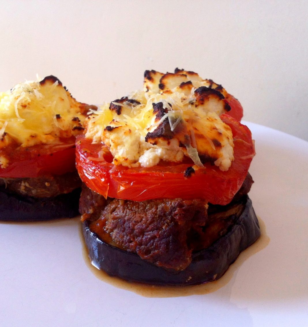 Σε κάθε φέτα μελιτζάνας βάζεις ένα κομμάτι μοσχαράκι, μια ροδέλα ή παραπάνω ντομάτα, μια κουταλιά από την σάλτσα του κοκκινιστού και τέλος ένα κομμάτι ξινομυζήθρα και λίγο τριμμένη γραβιέρα.