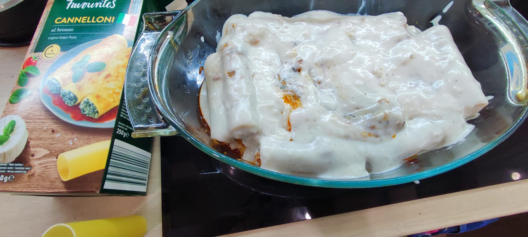 Ακολουθούμενη από με σάλτσα μπεσαμελ από πανω, μετα μια νέα σειρά κανελόνια τέλος με μια σάλτσα μπεσαμελ.