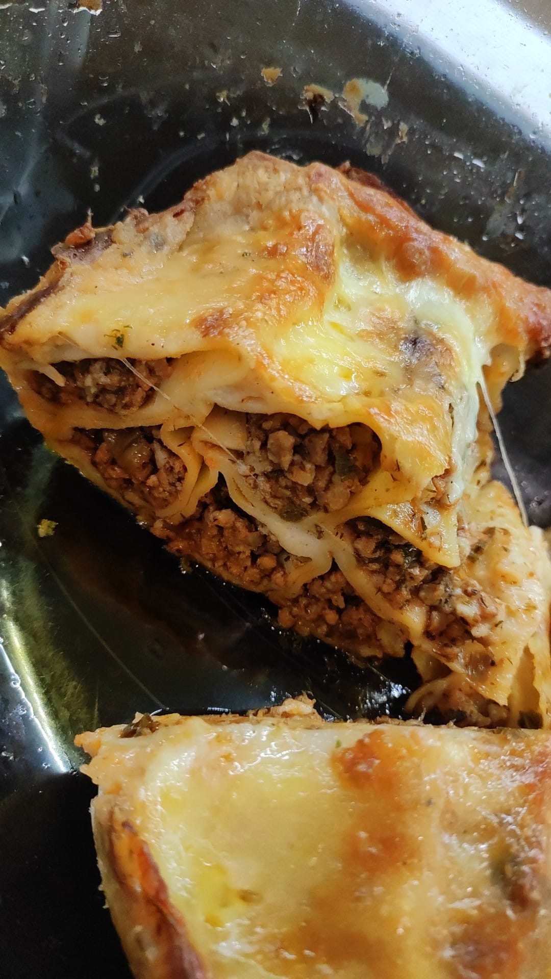 Σε ένα μεγάλο και ψηλό ταψι ή πυρεξ ρίξτε τη σάλτσα κιμα στον πάτο.