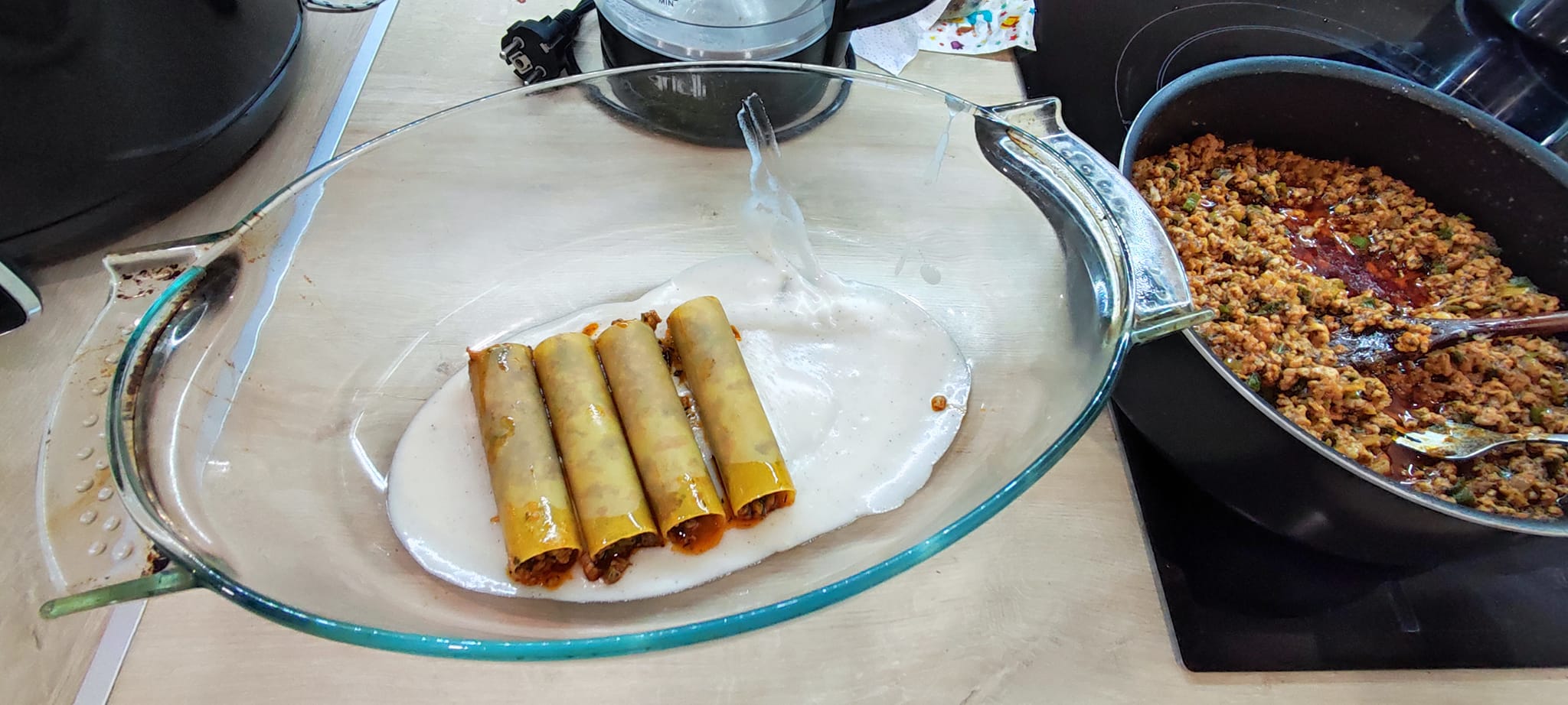 Μετά μια σειρά κανελόνια, τα οποία γεμίζω ένα ένα με ένα πιρούνι ή μια κουταλιά κιμά