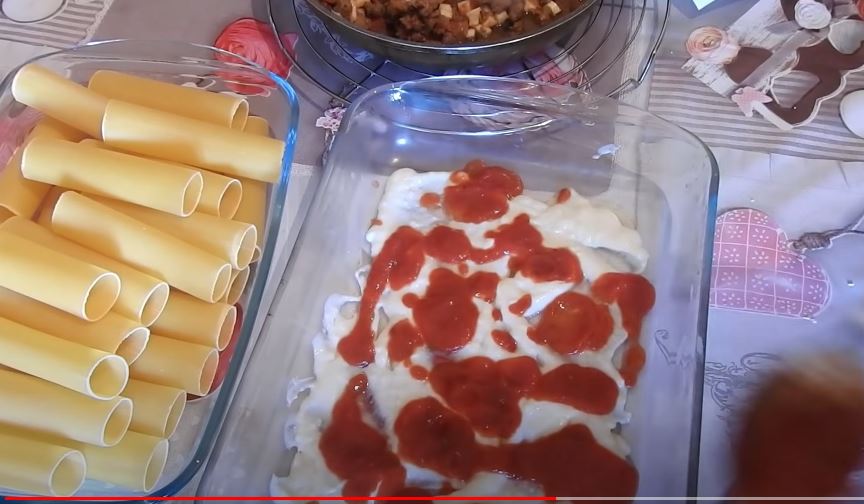 Πέρνουμε ένα ένα τα κανελόνια και γεμίστε τα με την γέμιση κιμά και βάλτε στο ταψί.