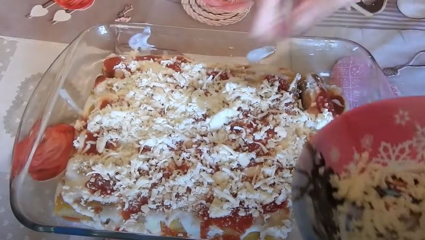 Ραντίζετε με την υπόλοιπη μπεσαμελ, σάλτσα ντομάτας και κεφαλογραβιερα.