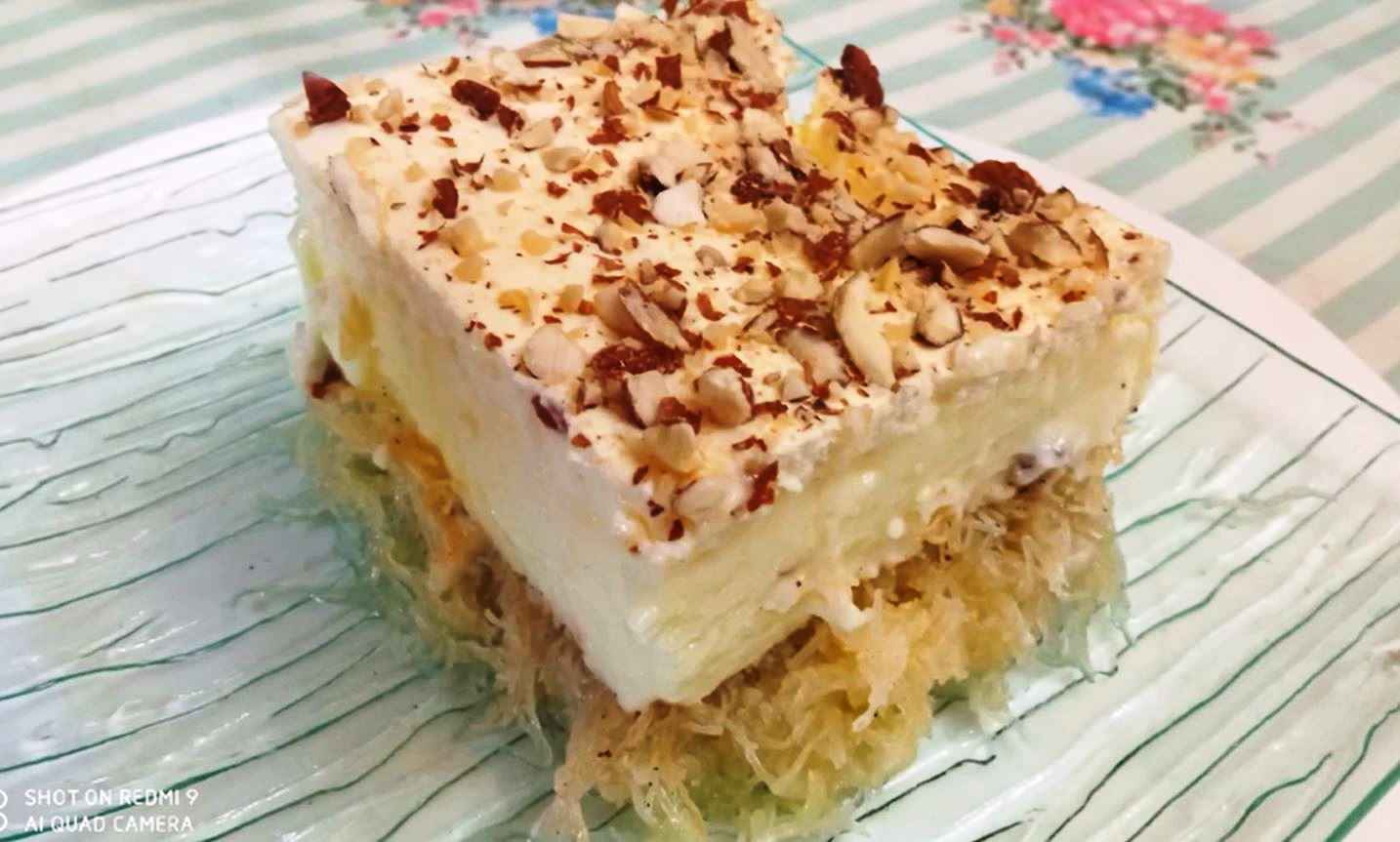 Απλώνουμε την κρέμα ομοιόμορφα πάνω από το κανταΐφι.