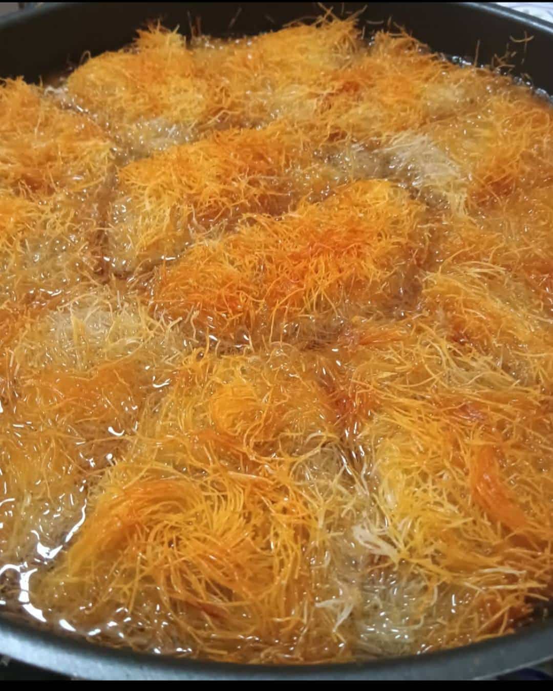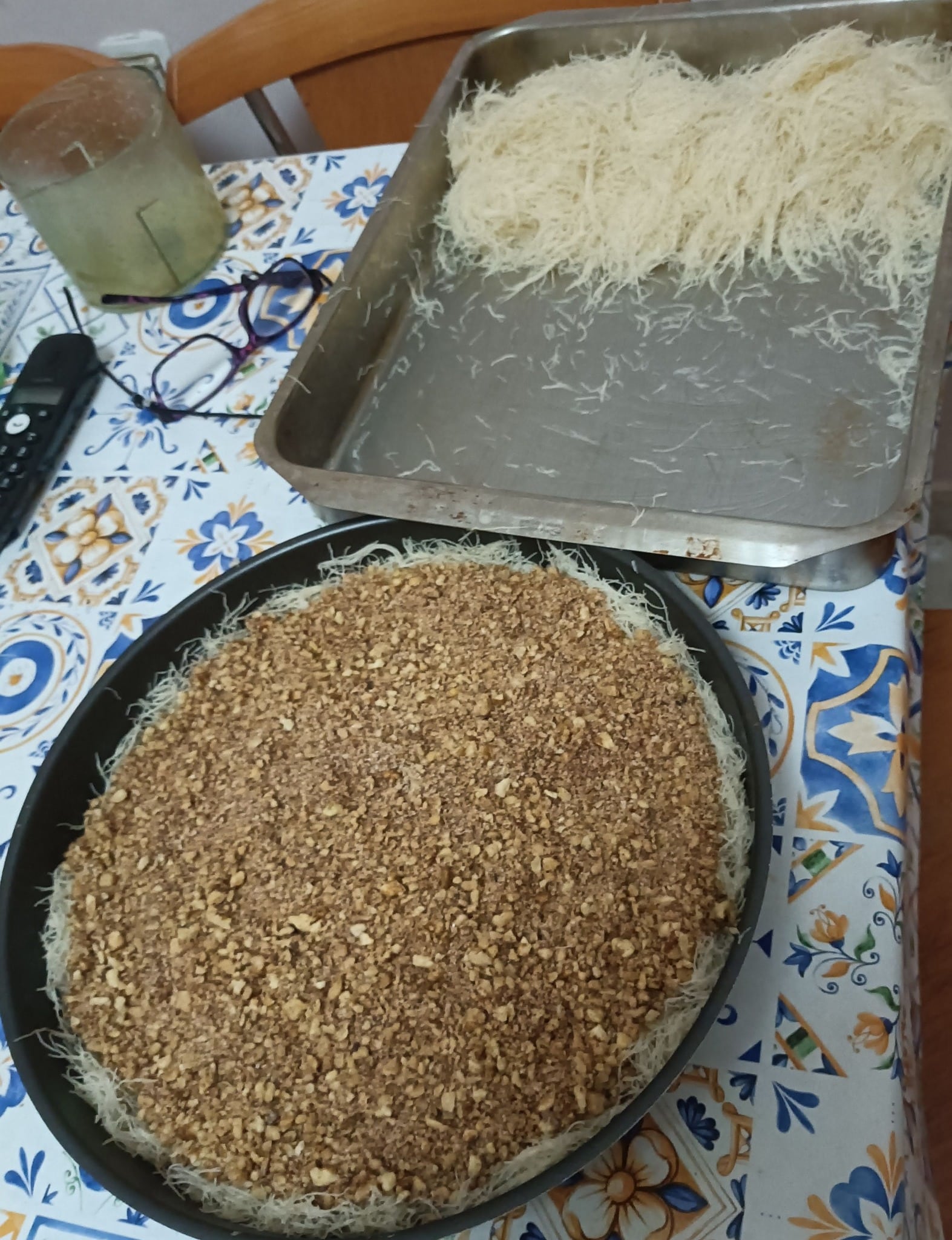 και μετά το υπόλοιπο κανταΐφι. Ψήνουμε στους 170 βαθμούς μια ώρα μέχρι να αποκτήσει το χρυσάφι χρώμα.