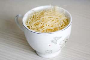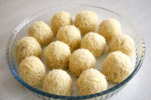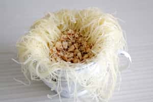 Πάρτε ένα μικρό φλιτζάνι του καφέ (τουρκικό φλιτζάνι καφέ, 50 ml.) Και γεμίστε το μισό με βουτυρωμένο kataifi. Ορισμένα μέρη του καταφύγιου θα πρέπει να βγαίνουν από το κύπελλο.