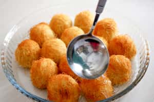 Ρίχνουμε το κρύο σιρόπι στα καταφύγια αμέσως μετά που τα βγάλουμε από το φούρνο. Αφήστε τα να απορροφήσουν όλο το σιρόπι για περίπου 1 ώρα.
