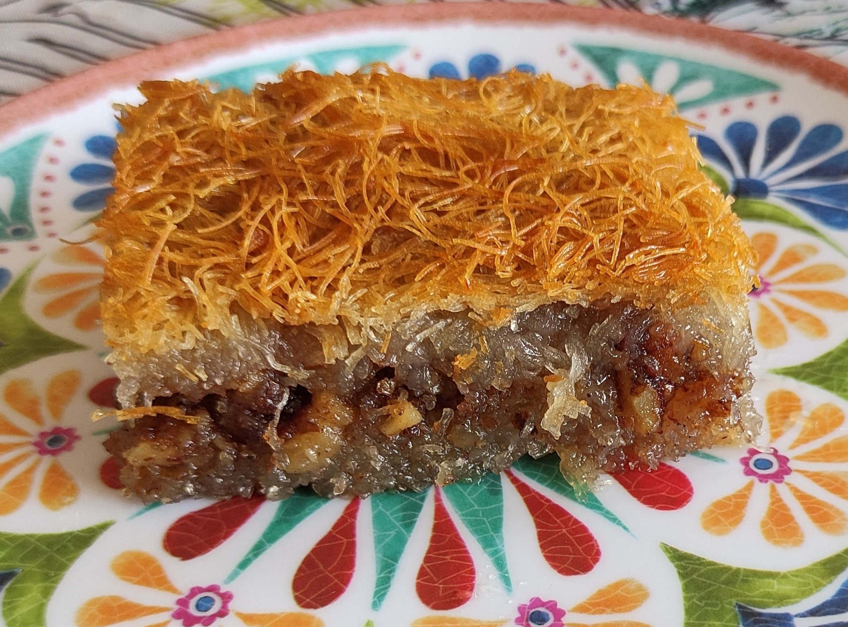 Ένα ταψί γεμάτο χρυσαφένιο, σιροπιασμένο κανταΐφι, πασπαλισμένο με τριμμένο καρύδι και κανέλα.