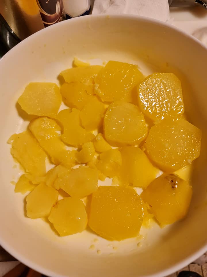 Βράζουμε τις πατάτες σε αλατισμένο νερό (μέχρι να τρυπιούνται εύκολα με ένα μαχαίρι). Στραγγίζουμε και περιμένουμε να σκληρύνουν, τις ξεφλουδίζουμε και τις κόβουμε σε φέτες.