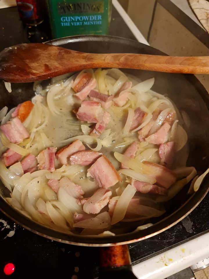 Σε πολύ λίγο λάδι (ίσως και χωρίς αυτό) τηγανίζω τα καπνιστό χοιρινό, προσθέτω κρεμμύδια και περιμένω να μαλακώσει σε μέτρια φωτιά.