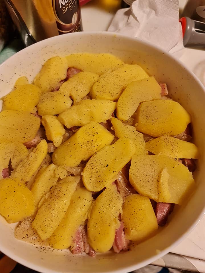 κρεμμύδια από πάνω και καπνιστό χοιρινό. Καλύψτε με μια δεύτερη στρώση πατάτες