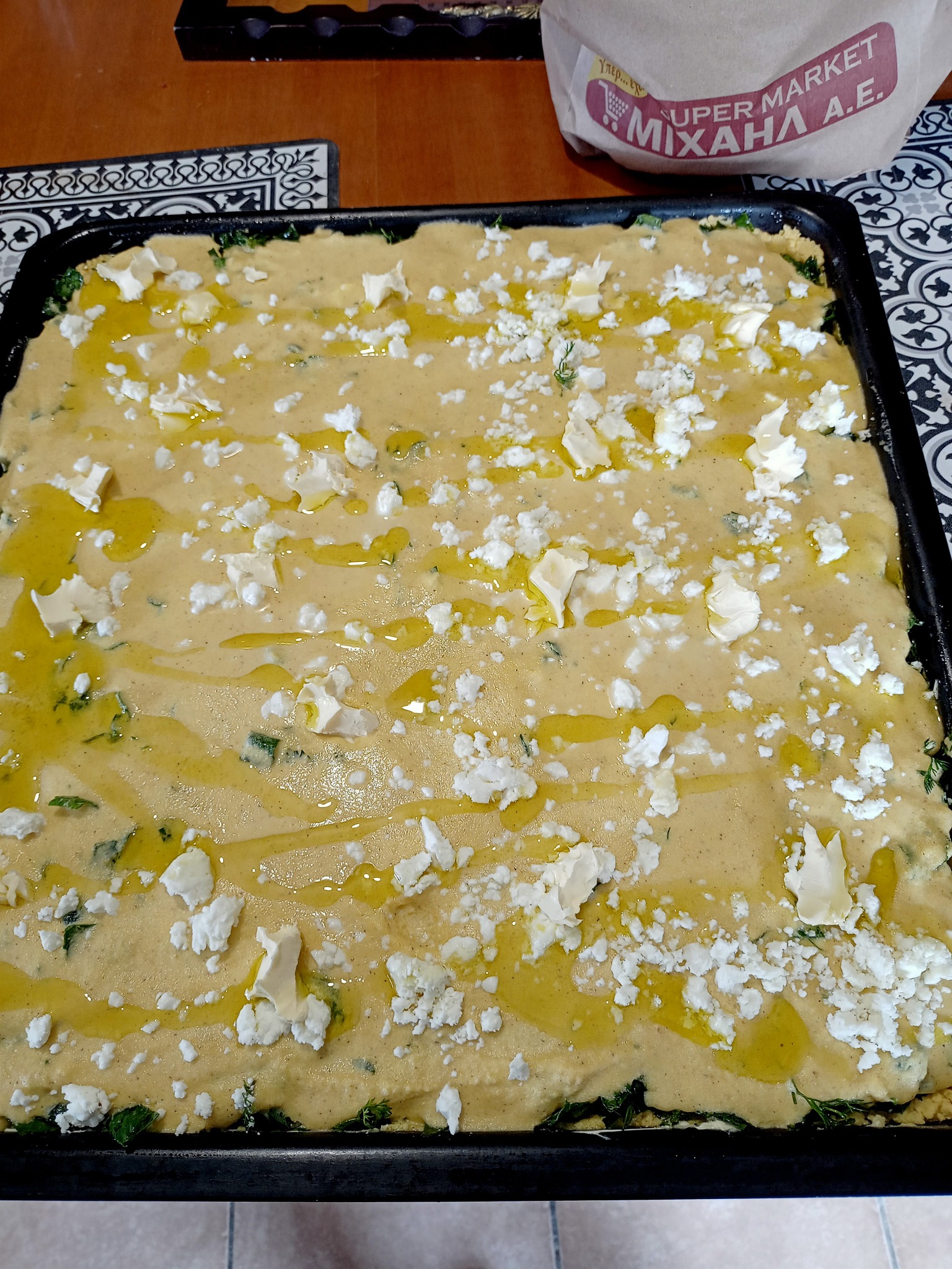 - Στη συνέχεια, παίρνω ένα ταψί, βάζω μαργαρίνη ή βούτυρο στον πάτο του και λίγο λάδι. Ρίχνω περίπου τον μισό χυλό στο ταψί και τον απλώνω ομοιόμορφα με το χέρι μου, πιέζοντας ελαφρά και σηκώνοντας λίγο τις άκρες γύρω-γύρω.