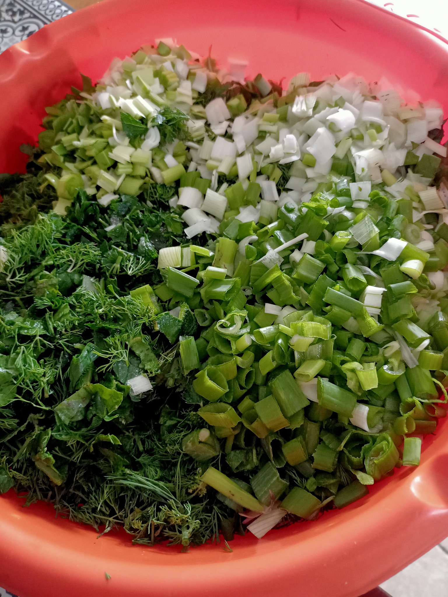 - 1 κιλό Διάφορα χόρτα (π.χ. σπανάκι, σέσκουλα, τσουκνίδα, λάπαθα, πράσο, φρέσκα κρεμμυδάκια, άνηθος, μαϊντανός - καθαρισμένα και ψιλοκομμένα)