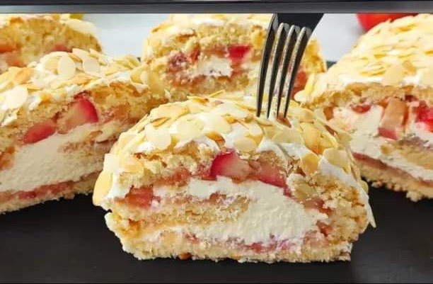 Τέλος, πασπαλίζουμε με 50 γρ αμύγδαλα καβουρδισμένα σε νιφάδες πάνω από το ρολό.