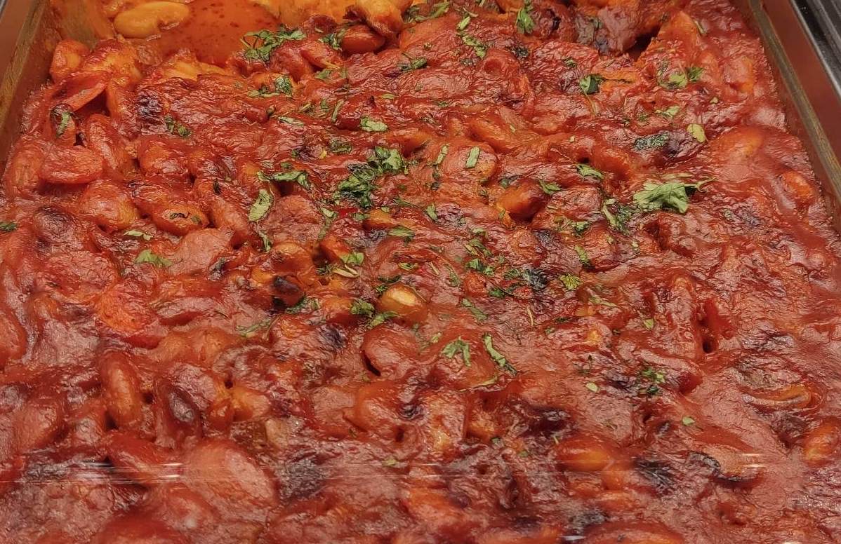 Περιχύνουμε με τη σάλτσα τα φασόλια. Προσθέστε περισσότερο νερό, αν χρειάζεται, για να σκεπαστούν τα φασόλια.