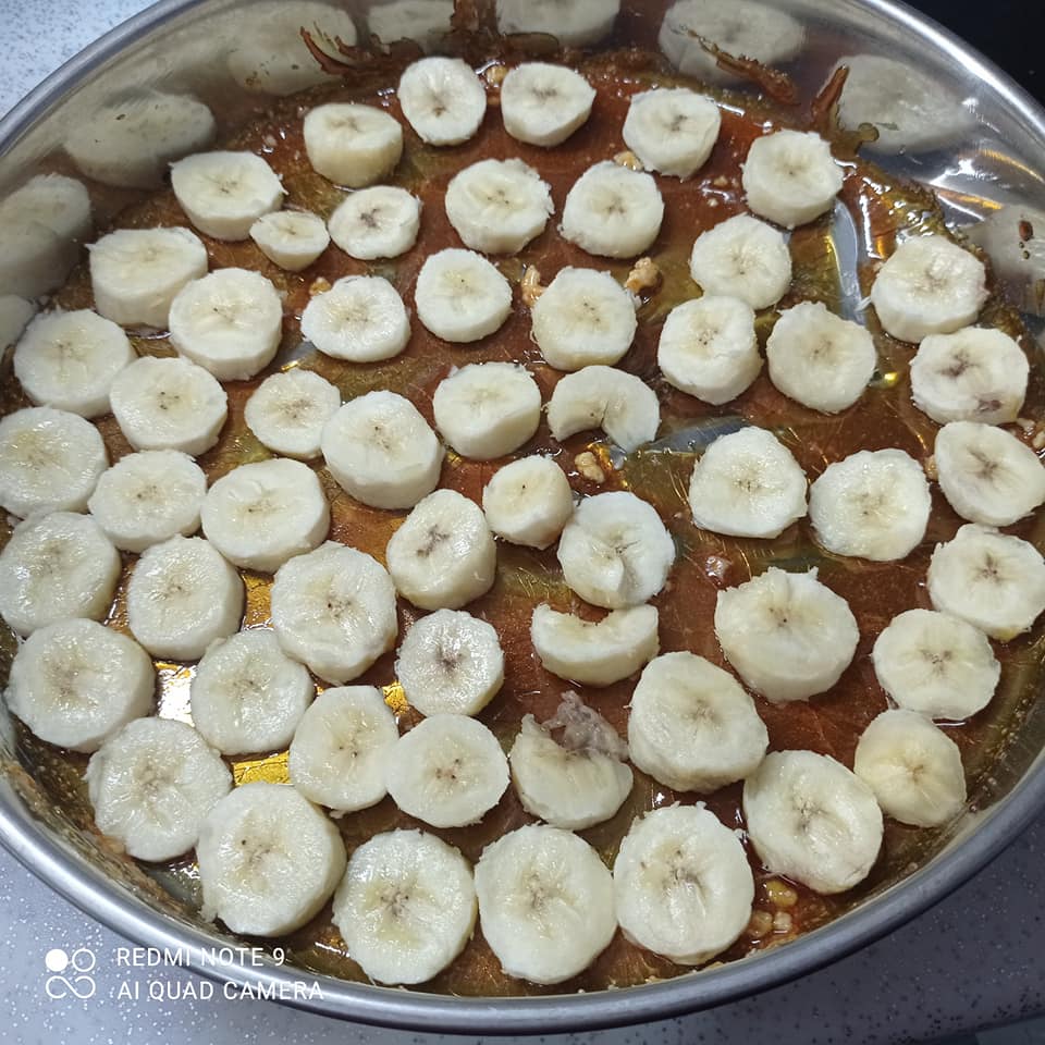 που έχουμε ετοιμάσει. Τακτοποίησα τις υπόλοιπες μπανάνες κομμένες σε κύκλους, απλώσαμε τη ζύμη απο πάνω.