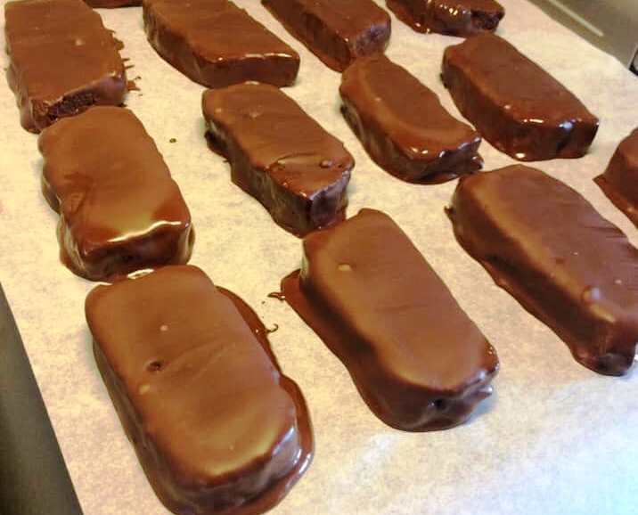 Σε ένα μπολ, λιώνουμε την κουβερτούρα σε μπεν μαρί, προσθέτοντας το λάδι για να γίνει πιο γυαλιστερή η γλασσά. Βουτάμε ένα-ένα τα παγωμένα μπαστούνια στη λιωμένη σοκολάτα και τα τοποθετούμε ξανά σε ένα ταψί στρωμένο με λαδόκολλα.