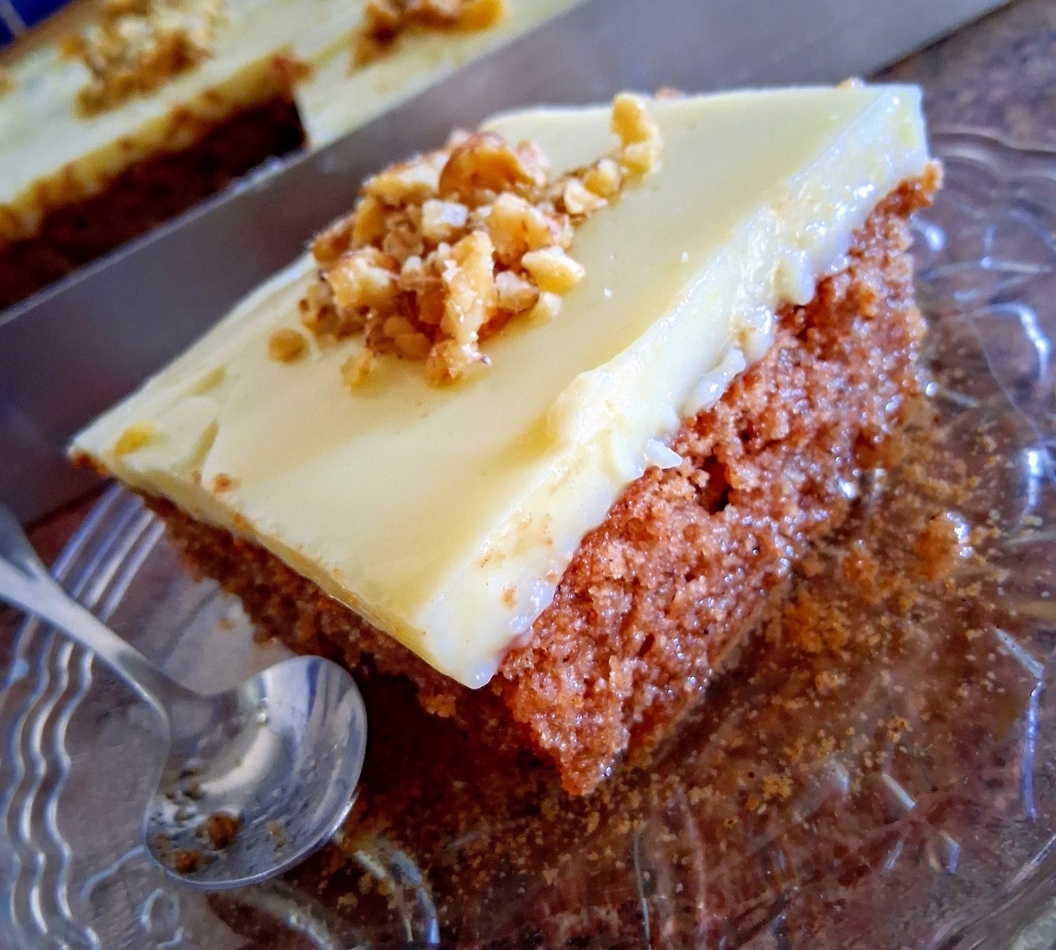 Απολαύστε μια ζουμερή καρυδόπιτα με έντονο άρωμα κανέλας και μοσχοκάρυδου, σκεπασμένη με μια βελούδινη κρέμα ζαχαροπλαστικής! Ιδανικό γλυκό για όλο τον χρόνο!