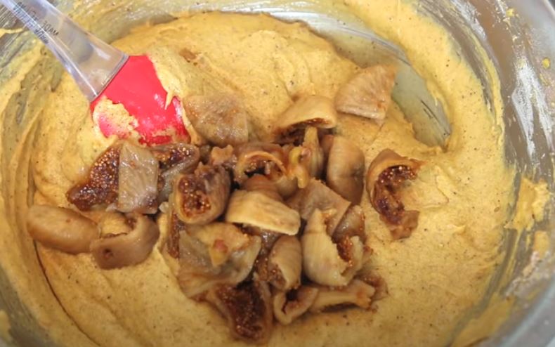 1- Στραγγίστε τα σύκα από το τσάι και κόψτε τα σε μικρά κομμάτια. Προσθέστε τα κομμάτια σύκου στο μείγμα και ανακατέψτε.