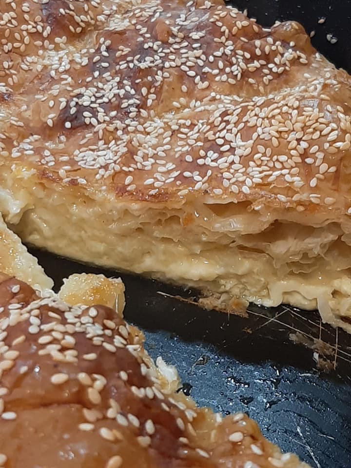 Ραντιζω μ ελαιόλαδο ενα στρογγυλό ταψί στρωνω 3 φύλλα, ρίχνω λιγο τυρί στρώνω άλλα δυο ραντιζοντας με ελαιόλαδο ξανά βάζω τυρί, επαναλαμβανω μέχρι να μου τελειώσει το τυρί κ να μου μείνουν 2 με 3 φύλλα. Γυρνάω τα φύλλα που εξεχουν μπρος τα μέσα σκεπάζω με τα υπόλοιπα που φύλαξα ραντιζοντας με ελαιόλαδο. Κοβω ακτινωτα την πίττα, χτυπαω αβγά γάλα αλάτι μοσχοκάρυδο κ περιχυνω ,αφηνω να τραβήξει η πίττα τα υγρά ενω πασπαλιζω κ με Σουσάμι. Ψηνω 180cαερα για 30 με 40 λεπτά ανάλογα τον φούρνο.