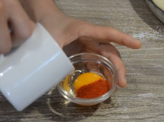 Σε ένα μπολ, αναμιγνύουμε μαζί τον κρόκο του αυγού με την πάπρικα και μία κουταλιά της σούπας λάδι.