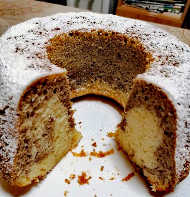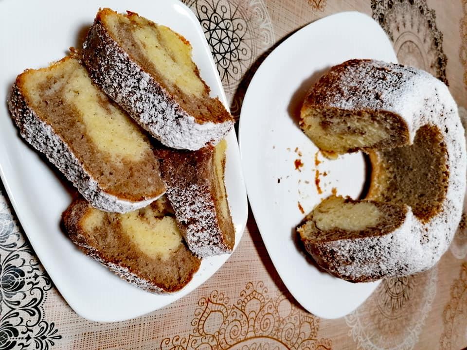 Αν κάποιο από τα δύο μέρη της ζύμης προέκυψε αραιό, προσθέτουμε αλεύρι, αν πάλι παραείναι σφιχτό, το «χαλαρώνουμε» προσθέτοντας με φειδώ γάλα. Αδειάζουμε εναλλάξ τις δύο ζύμες στη φόρμα: σε τέσσερις ή και έξι δόσεις για να εξασφαλίσουμε πως μετά το ξεφούρνισμα θα έχουμε τις επιθυμητές, λαχταριστές, σοκολατένιες καμπύλες στο εσωτερικό του.
