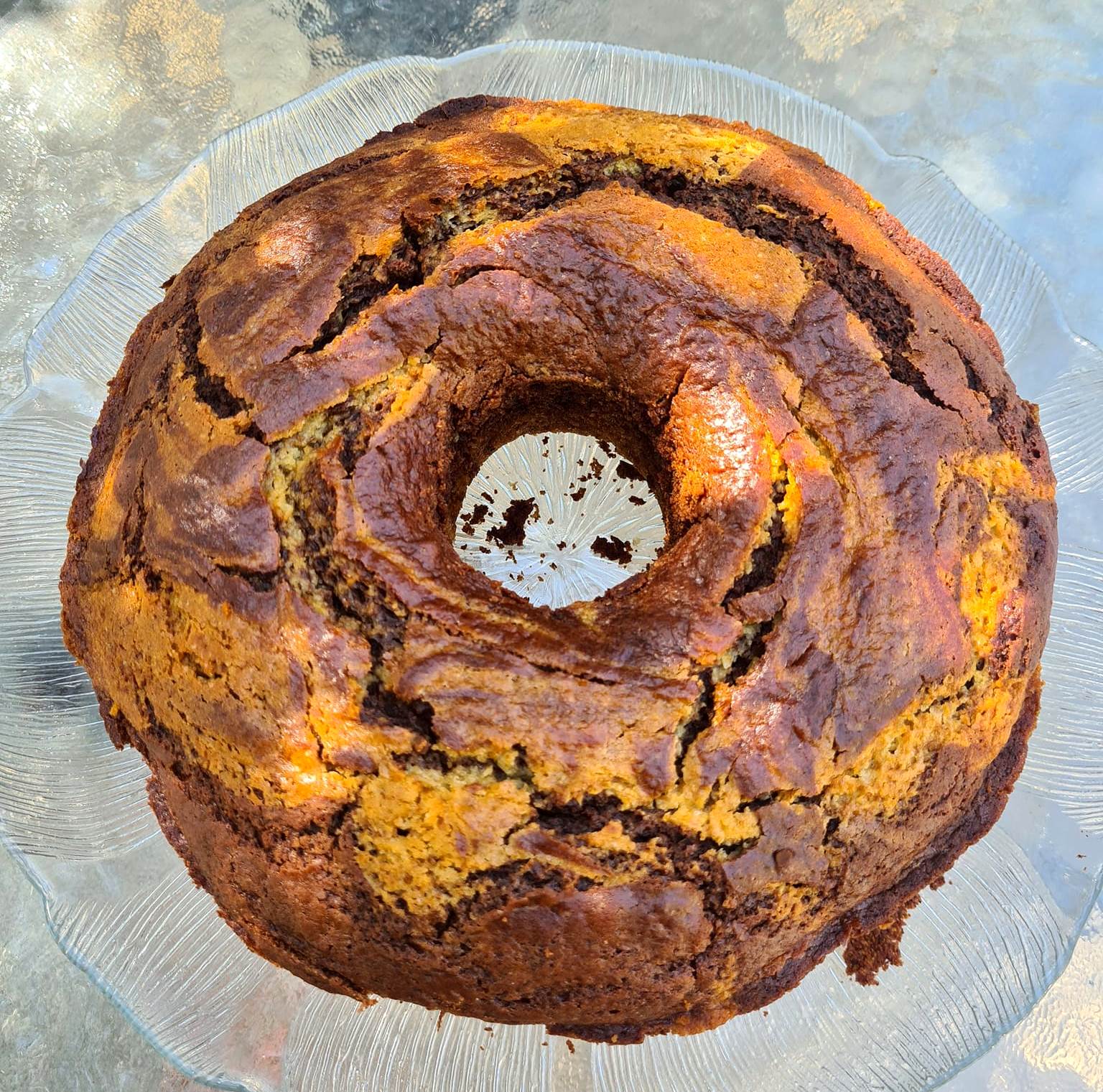 1. Στρώσεις: Παίρνετε με κουτάλα μίγμα πορτοκαλιού (βανίλιας) και το βάζετε εναλλάξ με μίγμα σοκολάτας στη φόρμα, σε στρώσεις το ένα πάνω από το άλλο (π.χ. 2 κ.σ. πορτοκάλι, μετά 2 κ.σ. σοκολάτα, στο ίδιο σημείο).