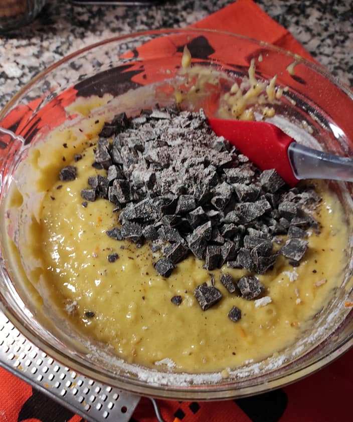 Σε ένα μπολ χτυπαμε για λίγο την ζάχαρη με το ελαιόλαδο με το σύρμα, μετά ένα ένα τα αυγά, την βανίλια ανακατεύοντας, προσθέτουμε το γιαούρτι, το ξύσμα πορτοκαλιού και σιγά σιγά με δόσεις το αλεύρι μέχρι να πάρει το μείγμα όλο το αλεύρι…. μετά Την σοκολάτα ψιλοκομμένη και ανακατεύουμε απαλά απαλά το μείγμα με μια σπάτουλα σιλικόνης.