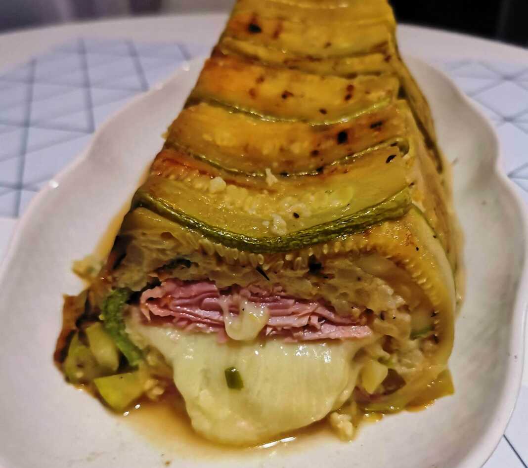 Βάζω το μισό μείγμα πατάτας. Στρώνω μια σειρά ζαμπόν και τριμμένη μοτσαρέλα. Επαναλαμβάνω πατάτες, ζαμπόν, μοτσαρέλα και τελειώνω με κολοκυθάκια.
