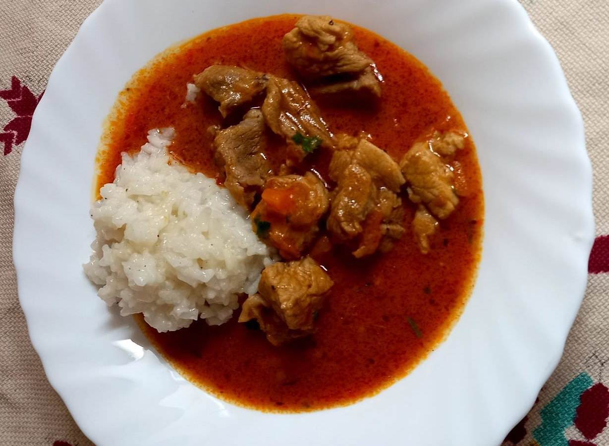 Προσθέστε αρκετό κρεμμύδι, κόκκινο πιπέρι, κρασί και νερό για να καλύψετε το κρέας. Βράζουμε μέχρι να ψηθεί το κρέας.