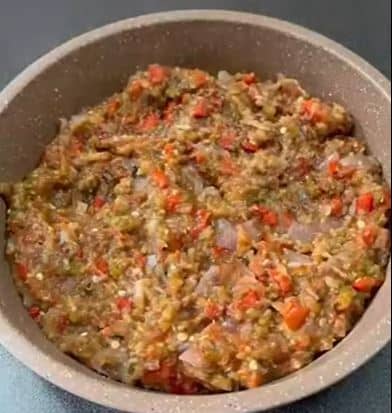 • Σε ένα ταψί αλειμμένο με λάδι, ψήστε ψιλοκομμένη μελιτζάνα, κρεμμύδι, κόκκινη πιπεριά, πράσινη πιπεριά και σκόρδο γο οποίο το τυλίγουμε