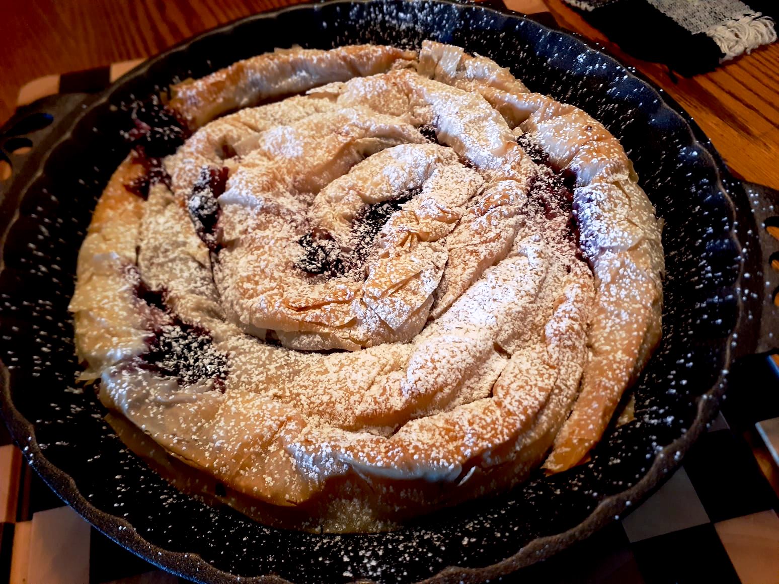 Τότε συνέχισε μέχρι να τελειώσουν τα υλικά. Στη συνέχεια βουτύρωνουμε ολόκληρη την πίτα και ψήνουμε στους 180 βαθμούς για περίπου 45 λεπτά. Στη συνέχεια πασπαλισα με λίγο ζάχαρη άχνη στην κορυφή.