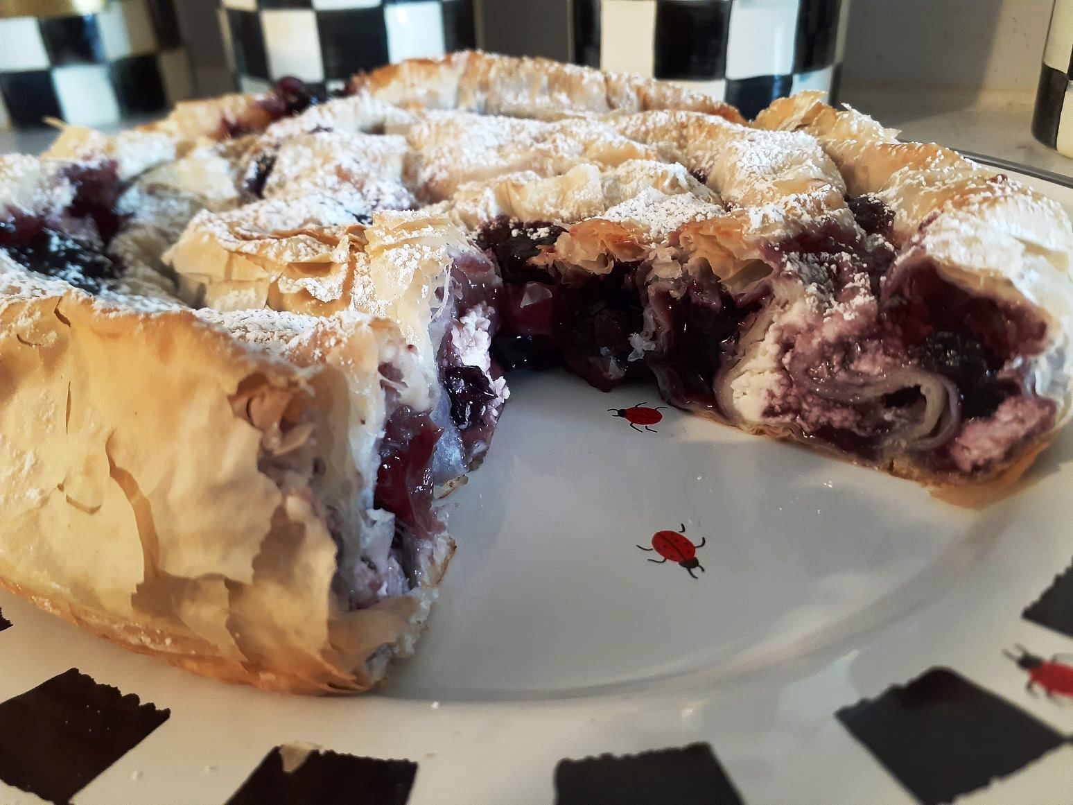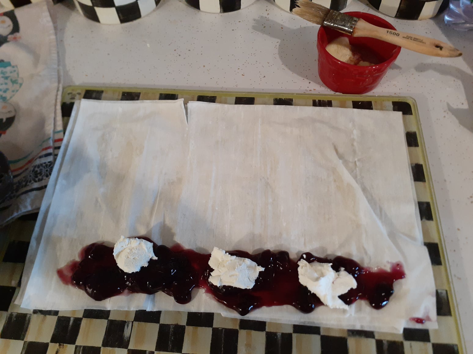 Ανοίξτε το φύλλο και απλώστε ένα φύλλο και το βουτύρώνουμε. Τοποθετήστε ένα δεύτερο φύλλο πάνω από αυτό και βουτύρώνουμεμε. Τοποθετήστε ένα τρίτο φύλλο και στη συνέχεια γεμίστε ολόκληρη την πλευρά του μεγάλου άκρου της ζύμης με το μείγμα κερασιού. Προσθέστε κουταλάκια του γλυκού τυρί κρέμα πάνω από τα φρούτα.