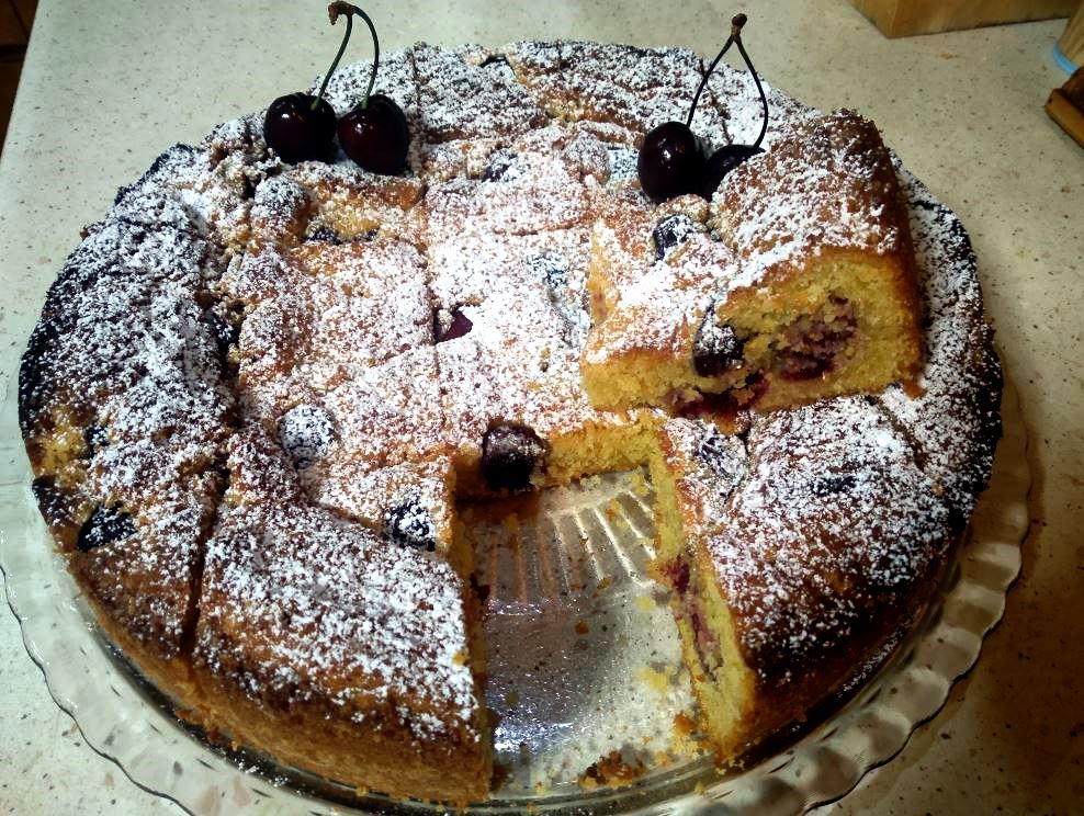 3)Προσθέτουμε τα κεράσια στο μείγμα,το ένα κοντά στο άλλο και ψήνουμε σε προθερμασμένο φούρνο στον αέρα,στους 175 βαθμούς,για περίπου 50′ λεπτά.
