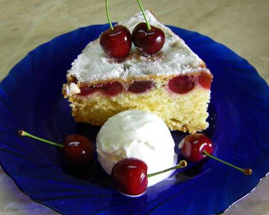 Πλένουμε τα κεράσια, αφαιρούμε τα κουκούτσια, σε κατάλληλο μπολ χτυπάμε τα αυγά με το μίξερ, προσθέτουμε σταδιακά τη ζάχαρη και συνεχίζουμε