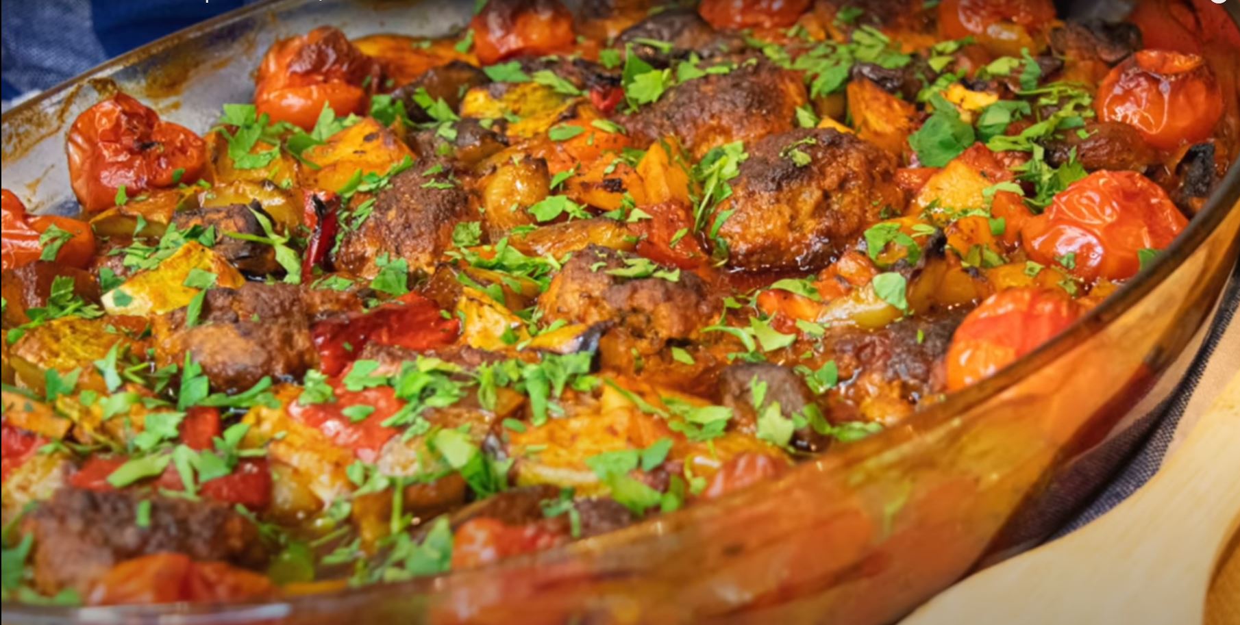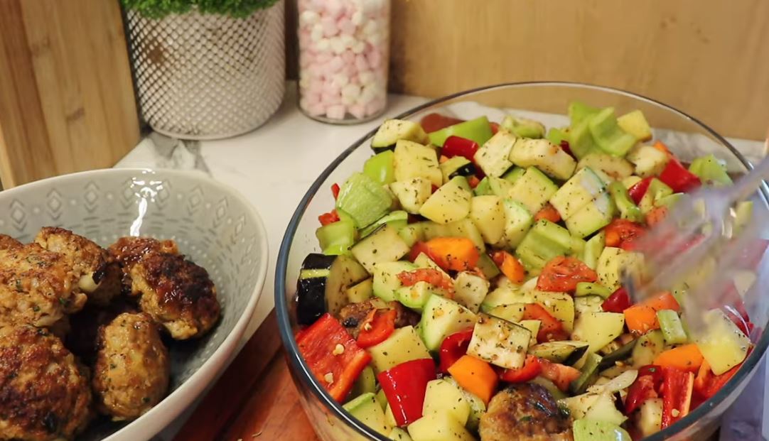 Λαδώνουμε ένα μεγάλο πυρέξ και ρίχνουμε μέσα τα κομμένα λαχανικά μας στη συνέχεια βάζουμε και τα κεφτεδάκια φροντίζοντας να τα καλύψουμε με τα λαχανικά .