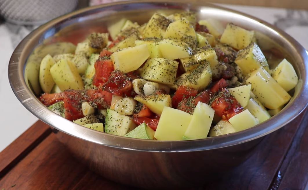 Κόβουμε όλα τα λαχανικά σε μεγάλα κομμάτια και τα βάζουμε σε ένα μεγάλο μπολ.