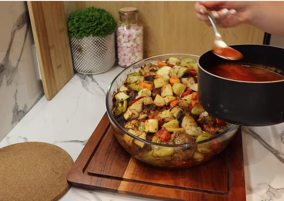 Βγάζουμε το πυρέξ από το φούρνο και περιχύνουμε το φαγητό μας κουταλιά-κουταλιά με τη σάλτσα της ντομάτας.