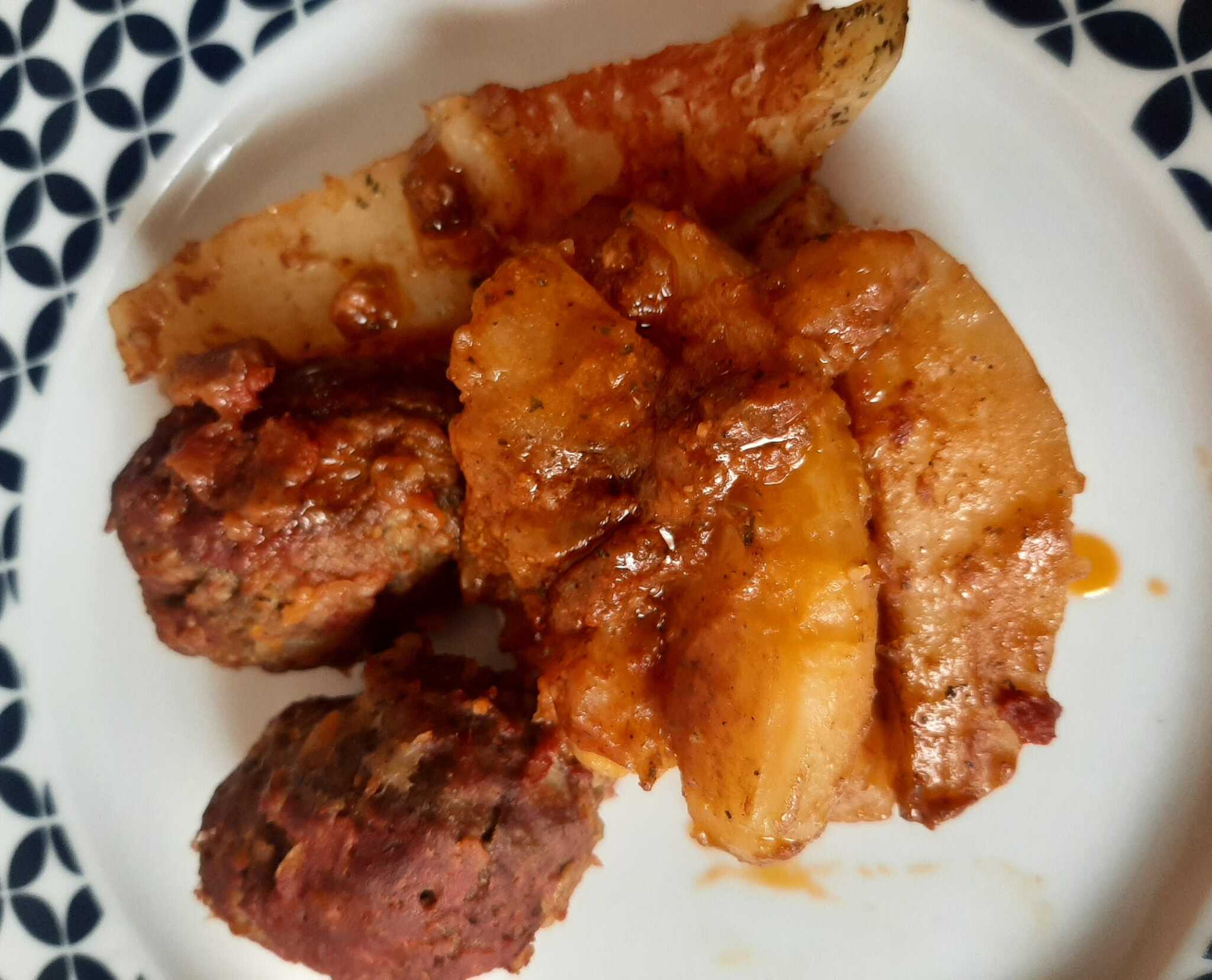 Τέλος, βάζουμε τα κεφτεδάκια από πάνω τους και ψήνουμε στους 200-220οC για 60′-70′ περίπου.