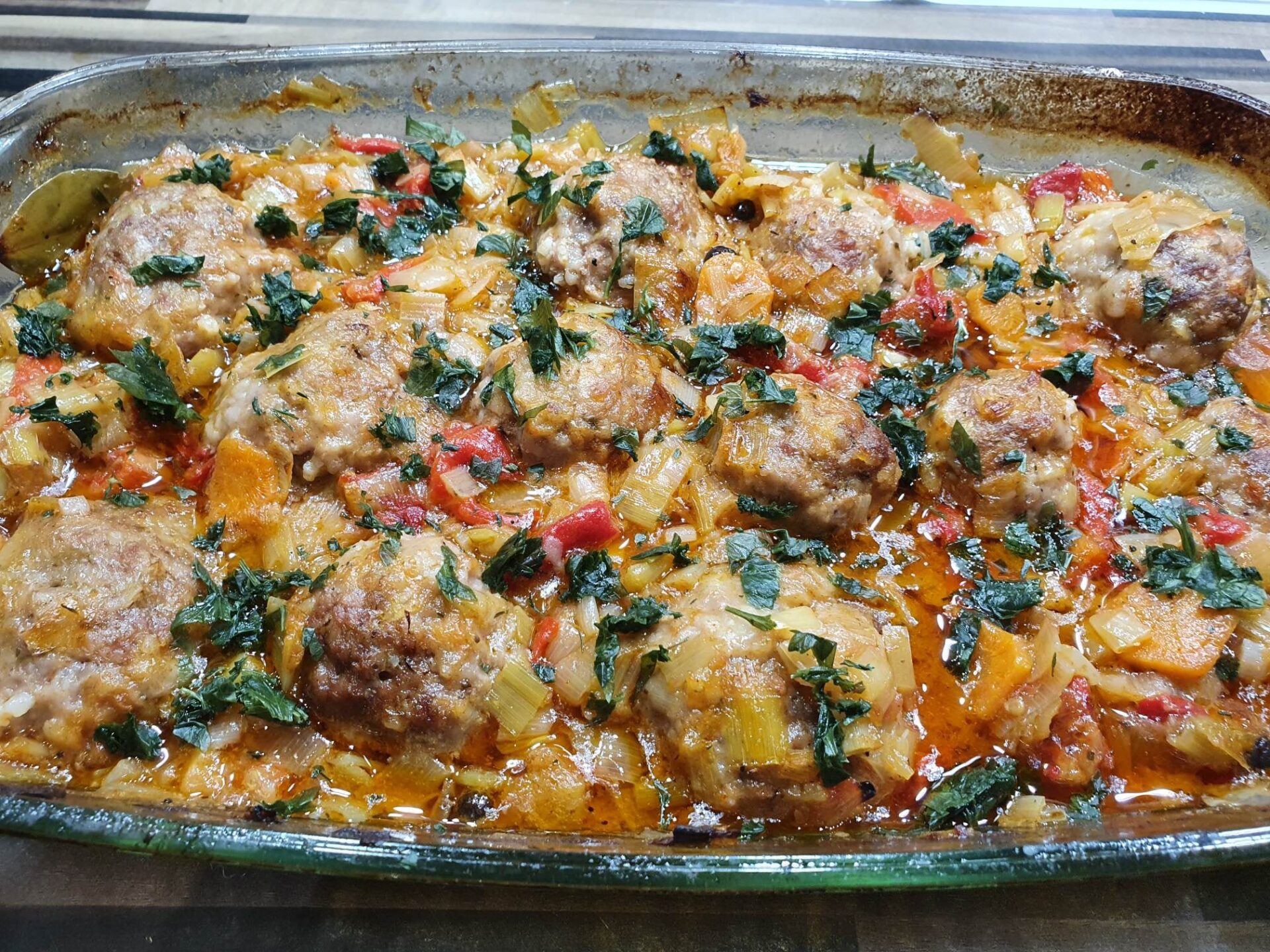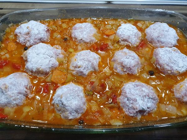 Άφησα να βράσει για 5 λεπτά και πρόσθεσα 100 ml λευκό κρασί, το κατέβασα από τη φωτιά και το μετέφερα σε ταψί, Τυλίγω σε αλεύρι τα κεφτεδάκια και τα στρώνω στο ταψί.