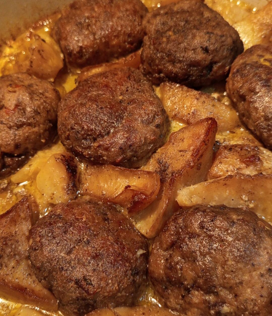Ζύμωσα τον κιμά με κρεμμύδι, σκόρδο ψιλοκομμένα, ψωμί μουλιασμένες και στιμμένες καλά, αυγό, αλάτι πιπέρι, ρίγανη, πάπρικα, μπαχάρι και ελαιόλαδο.