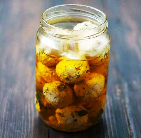 Φτιάξτε μπάλες μεγέθους δαγκώματος από το μείγμα φέτας και τοποθετήστε τις στο βάζο με το αρωματικό ελαιόλαδο.