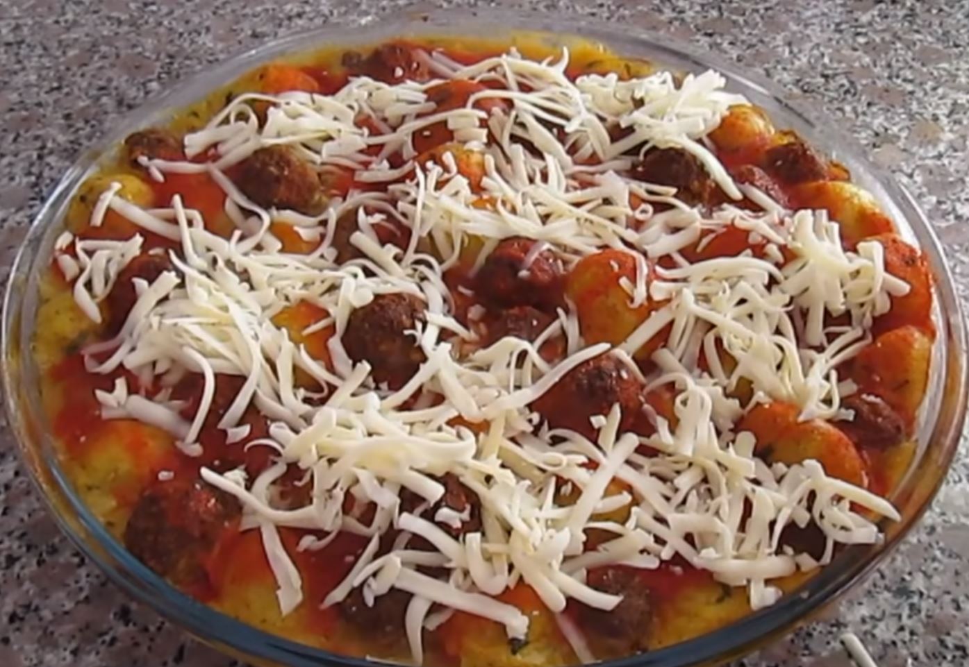 Λαδώνουμε και Στρώνουμε ένα πυρέξ με ντομάτες κομμένες σε φέτες και απο πάνω απλώνουμε τα κεφτεδάκια κιμα και πατάτας και διανέμουμε ομοιόμορφα.