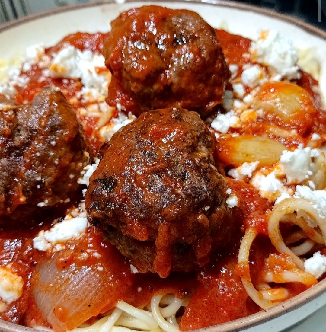 Κεφτεδάκια κοκκινιστά με μακαρόνια