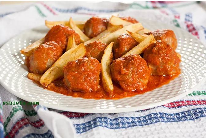 Κεφτεδάκια κοκκινιστά με τηγανιτές πατάτες