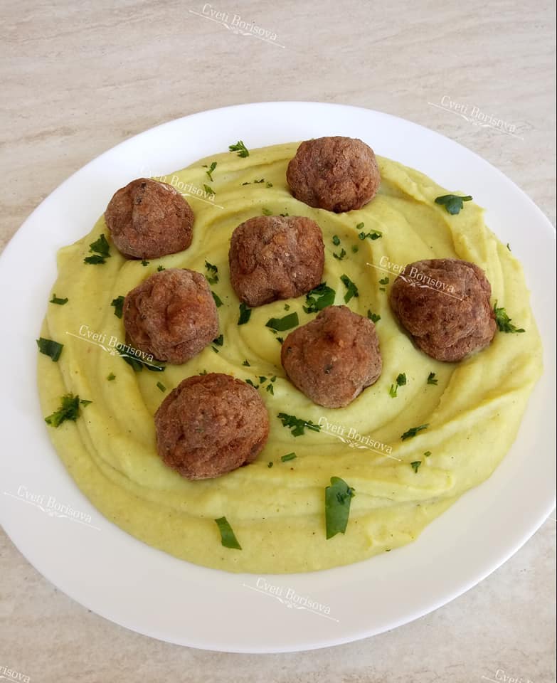 Σερβίρουμε τους κεφτέδες στον πουρέ πατάτας.